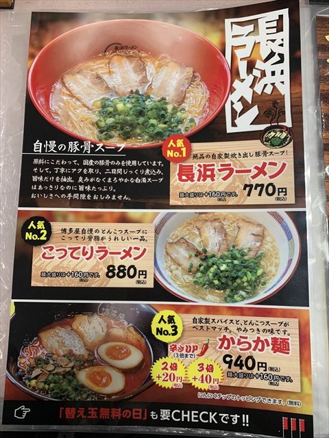 なんといっても長浜ラーメン770円。以前は750円でしたが。
