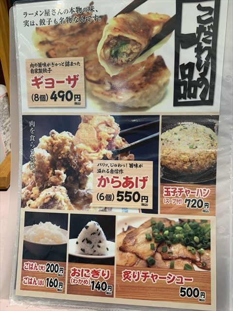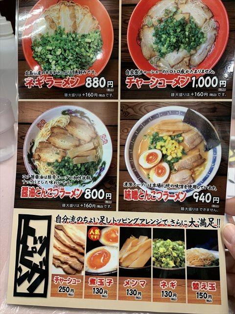 チャーシュー250円、煮卵130円、メンマ130円、ネギ130円、替玉150円