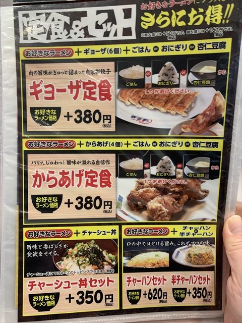 ギョーザ定食(好きなラーメン、ギョーザ6個、ごはんかおにぎりか杏仁)