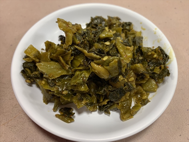 大好きなのは、こちら。辛子高菜です。注文し終えたらすぐさま小皿にとり小腹を満たします。